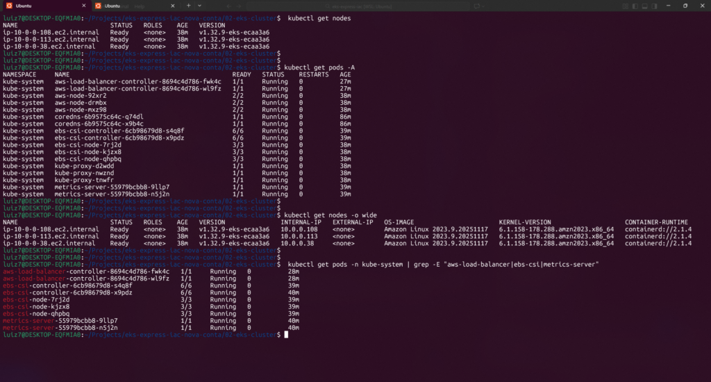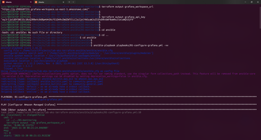 Enquanto o Terraform constrói a "caixa", o Ansible a configura. Utilização de playbooks para automatizar tarefas "Day-2", como a configuração do aws-auth para permitir acesso aos nós, instalação de Add-ons essenciais e drivers de armazenamento (CSI), garantindo que o cluster nasça pronto para uso.