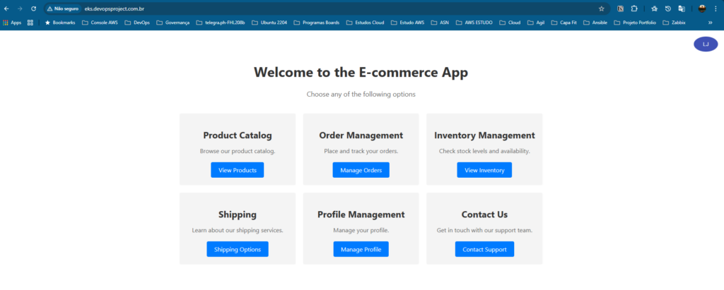 Prova de conceito final com o deploy de uma aplicação web. O sucesso do acesso externo via Load Balancer valida toda a cadeia de automação: desde as regras de roteamento da VPC, passando pelos Security Groups, até a orquestração dos contêineres pelo Kubernetes.