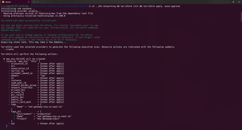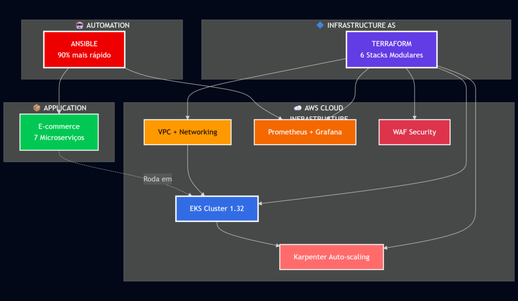Implementação de uma infraestrutura Kubernetes completa e escalável na AWS utilizando a metodologia “Infrastructure as Code” (IaC). O projeto utiliza Terraform para o provisionamento idempotente de recursos de rede (VPC) e computação (Cluster EKS), integrado com Ansible para a configuração pós-provisionamento e gerenciamento de aplicações. O resultado é um ambiente production-ready criado em minutos com intervenção humana zero.