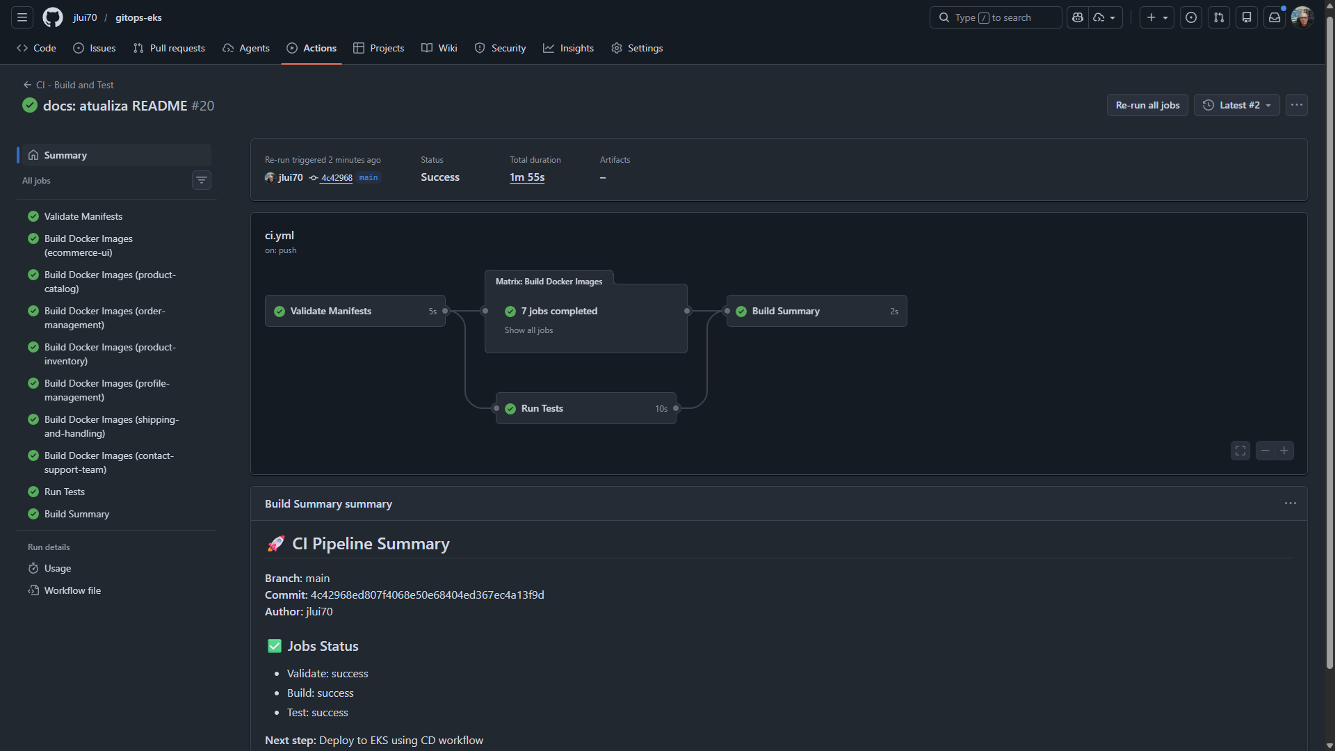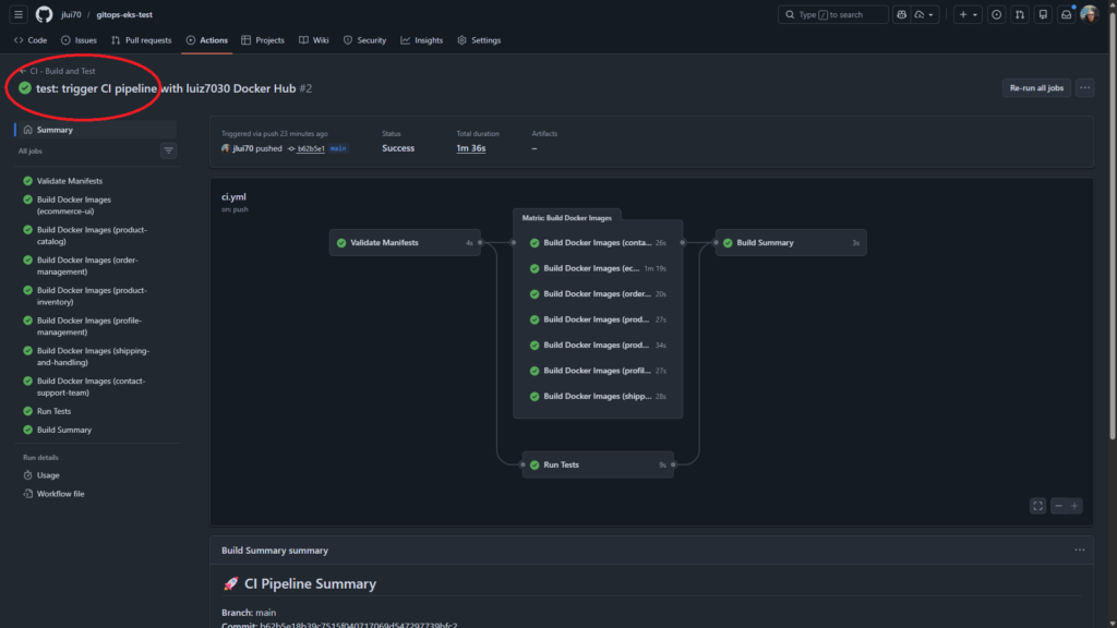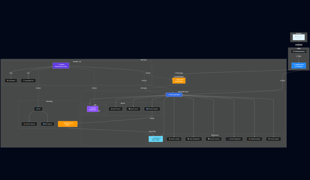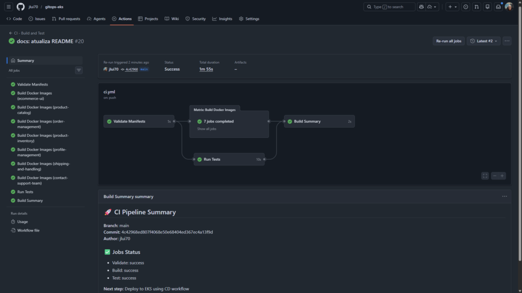 Automação end-to-end onde cada push no Git dispara uma pipeline de validação. O GitHub Actions constrói as imagens Docker dos 7 microsserviços, publica no Amazon ECR e inicia o processo de deploy no EKS, eliminando intervenções manuais e garantindo consistência entre o código e a infraestrutura.
