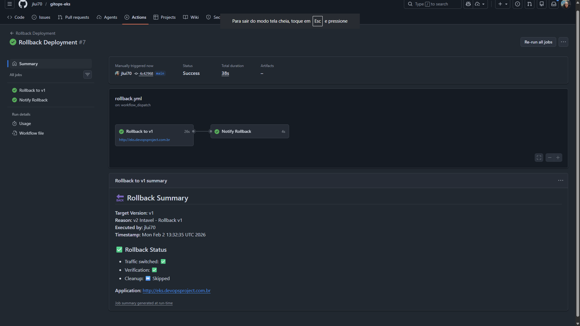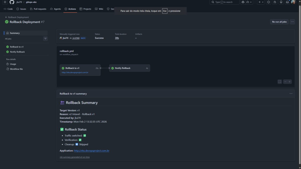 O "pulo do gato" da operação: a manipulação inteligente dos seletores de serviço. A troca de tráfego é atômica e instantânea. Caso a nova versão apresente falhas após a liberação, a pipeline executa um rollback automático em menos de 30 segundos, revertendo o apontamento para a versão anterior estável.
